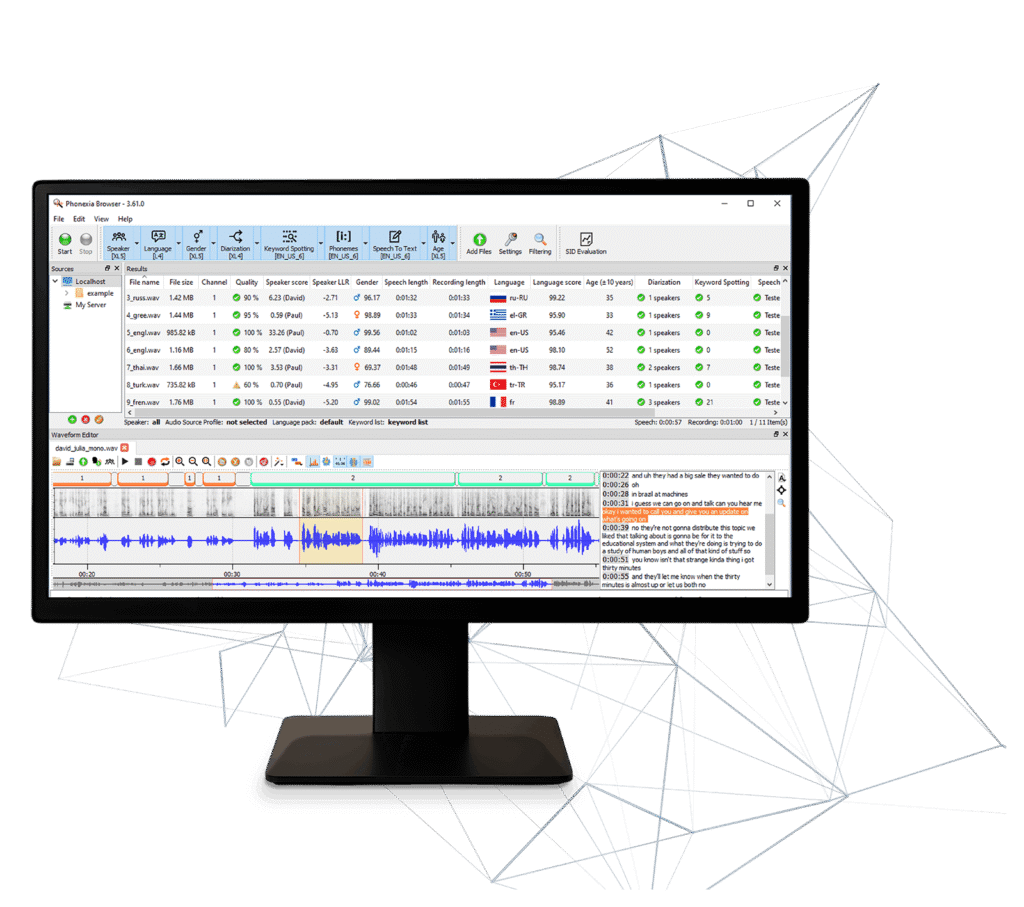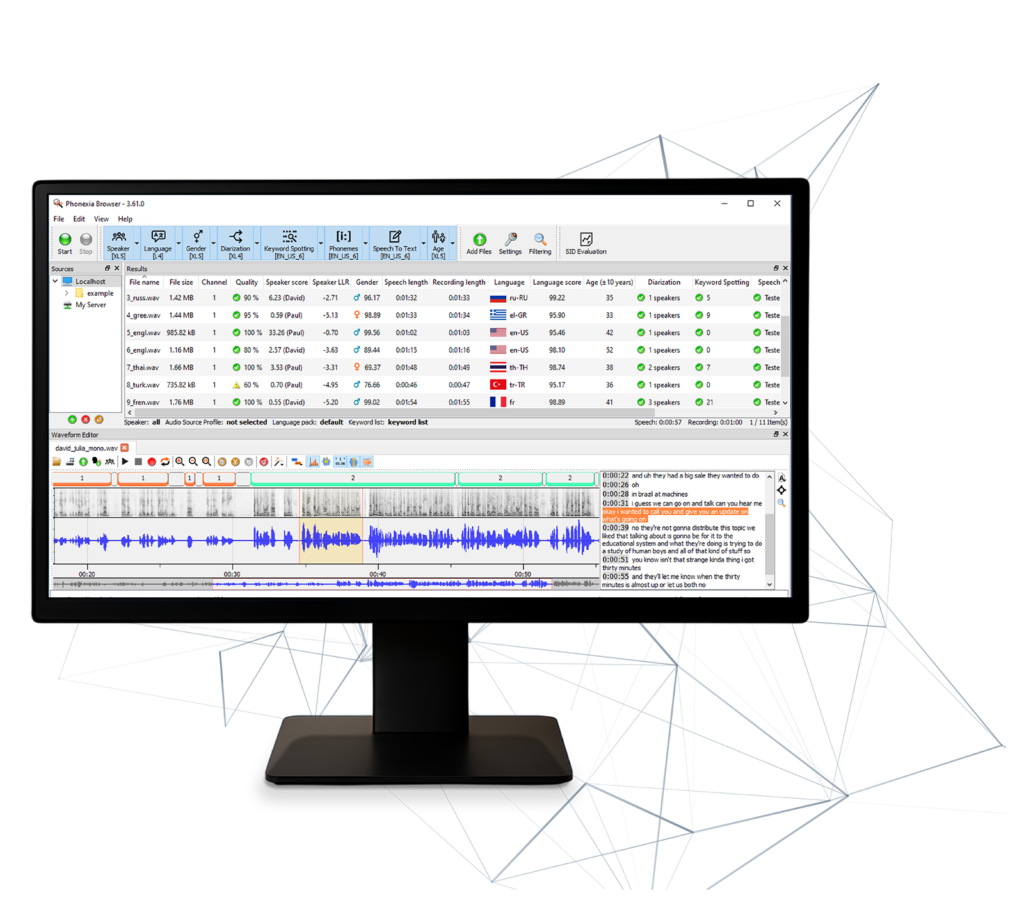 Phonexia Speech Platform, ses biyometrisi ve konuşma tanıma teknolojileriyle konuşmacıları anında tanımanızı ve ses verilerini hızlıca analiz ederek bağlamı keşfetmenizi sağlayan ölçeklenebilir bir ses adli bilişim çözümüdür.
